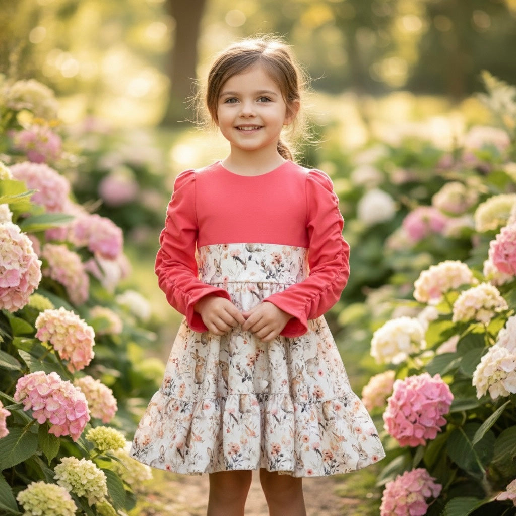 Capture hearts and imaginations with this enchanting dress from Young World by Ruth! Crafted in a dreamy coral coloured bodice and finished with a magical bunny-print skirt, it’s designed to make your little one feel like they’ve stepped straight into a fairy tale. From the delightful ruching on the sleeves to the show-stopping bow at the back, every detail adds a dash of wonder to every twirl. Perfect for birthdays, tea parties, or simply brightening an ordinary day. This dress promises comfort, style, and a spark of imagination. Don’t miss your chance to bring home this whimsical wardrobe treasure—order now and let your child’s next adventure begin in storybook fashion!