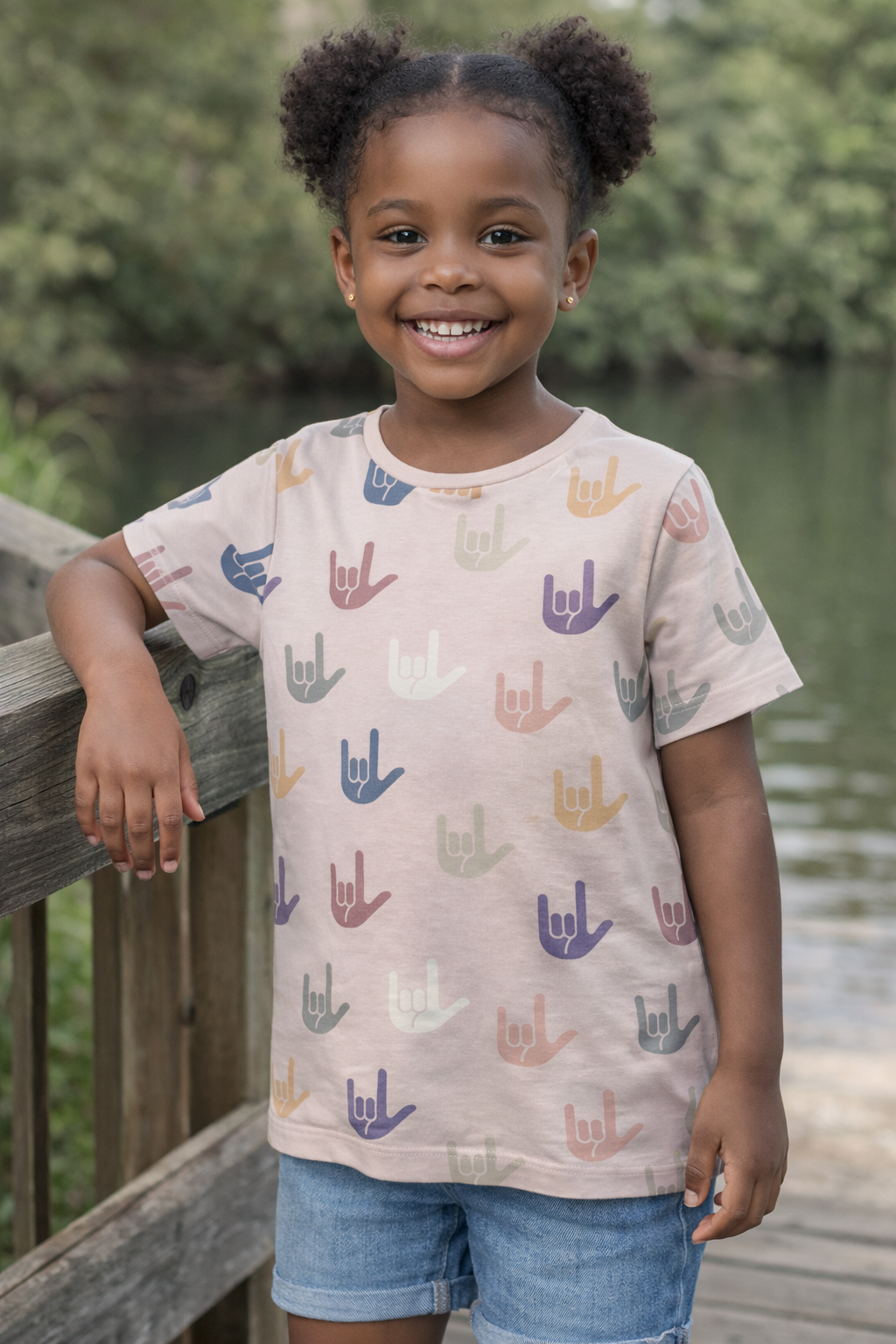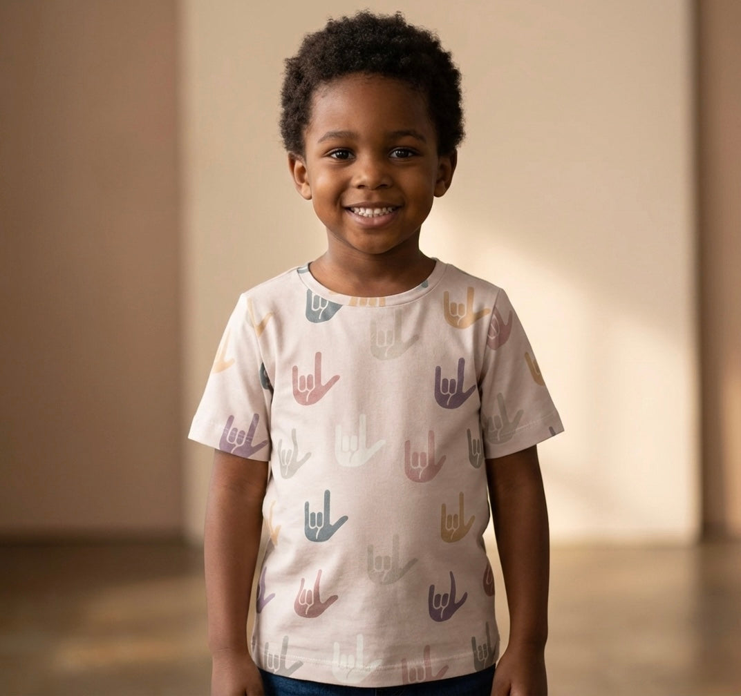 Crafted in small batches, the Shari Tee features a soft neutral base with a delicate, repeating hand-sign graphic motif in calming, muted tones. The design is inspired by connection and communication, offering a gentle visual message of love and inclusion. This makes it a meaningful choice for families seeking inclusive kids clothing, gender-neutral children’s apparel, or a thoughtful gift for little ones.